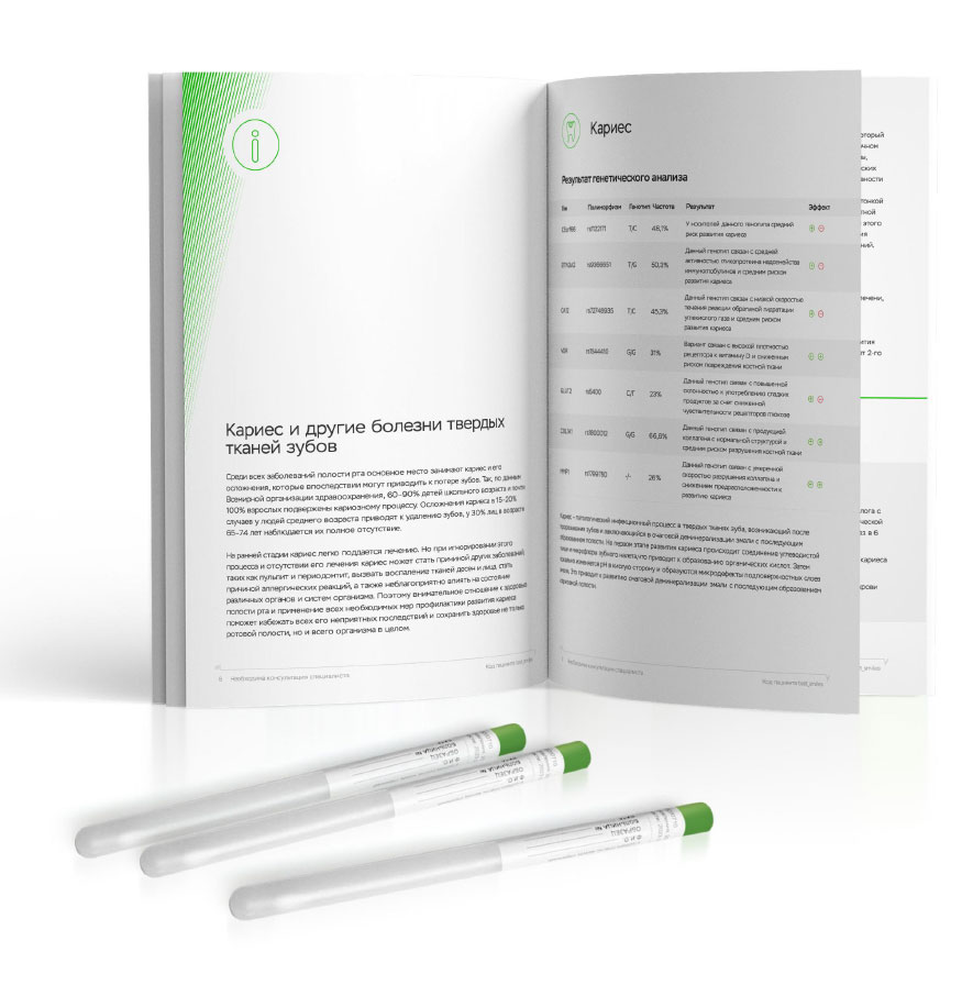 Исследует генетические особенности, связанные со здоровьем зубов и полости рта. Помогает оценить риск кариеса и других болезней, рассчитать скорость восстановления тканей.